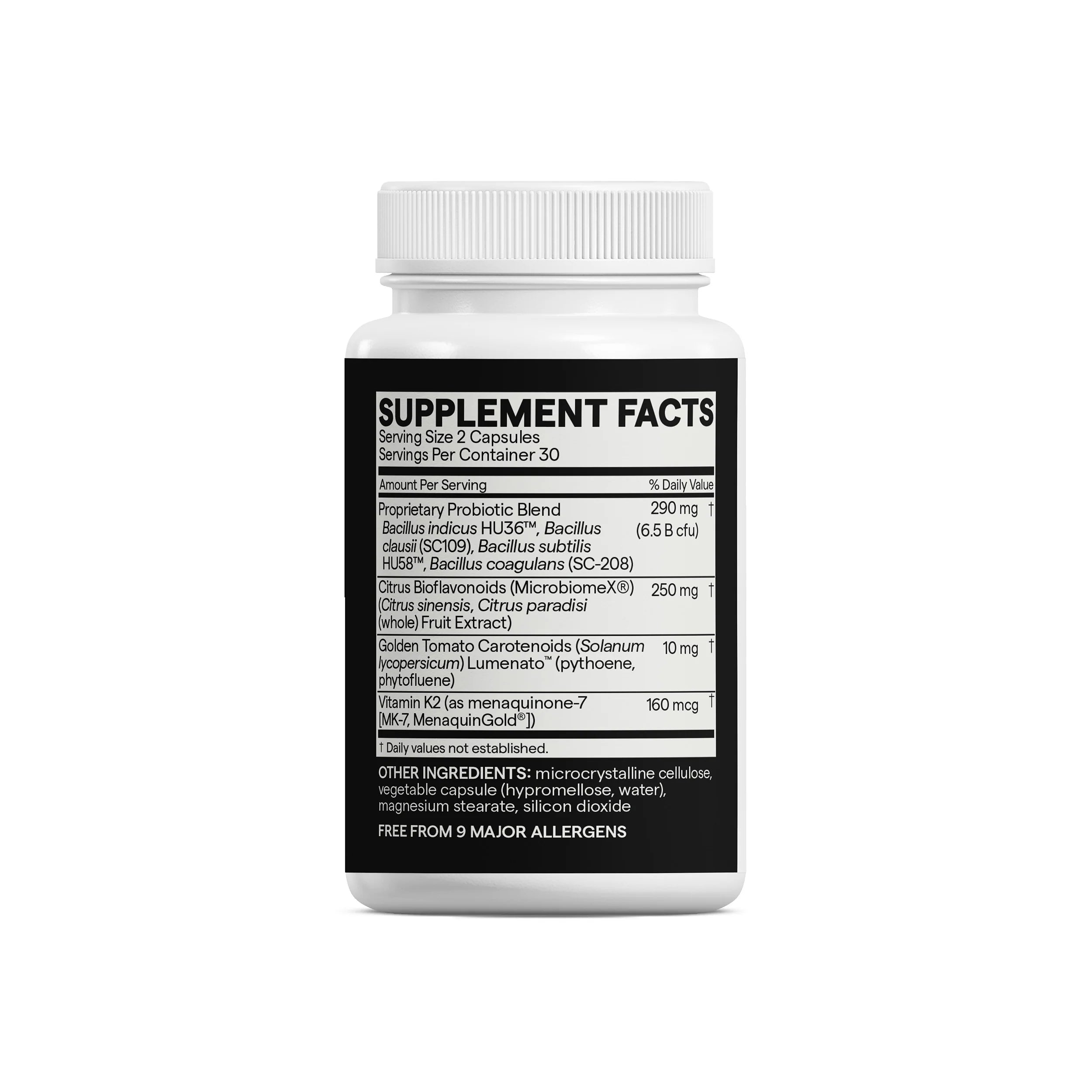 Inside, beneficial bacteria in Biome Balance Within produce nourishing short-chain fatty acids that create an anti-inflammatory, immune-supportive environment. This balanced internal ecosystem supports the modulation of the immune response and sets the stage for clear, hydrated, and resilient skin.